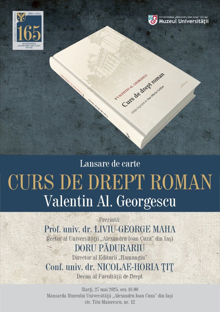 Marți, 27 mai 2025, ora 18, în mansarda Muzeului Universității „Alexandru Ioan Cuza” din Iași, va avea loc lansarea lucrării „Curs de drept roman” de Valentin Al. Georgescu.