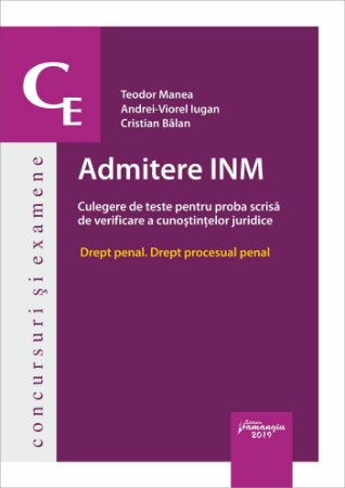 Lucrarea Admitere INM. Culegere de teste pentru proba scrisa de verificare a cunostintelor juridice cuprinde 40 de teste din materiile drept penal si drept procesual penal, atat partea generala, cat si partea speciala. Fiecare test contine subiecte de teorie si spete cu un grad ridicat de complexitate, urmarind sa faciliteze aprofundarea si analiza celor mai relevante probleme ale celor doua materii vizate.