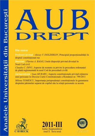 Partea a III-a a Analelor Universitatii din Bucuresti, Seria Drept, debuteaza la rubrica Profesori invitati cu articolul profesorului Alexey Dolzhikov, care prezinta fundamentul principiului proportionalitatii in dreptul constitutional rus, elementele sale materiale, precum si limitele de aplicare a acestuia de catre Tribunalul Constitutional al Federatiei Ruse.