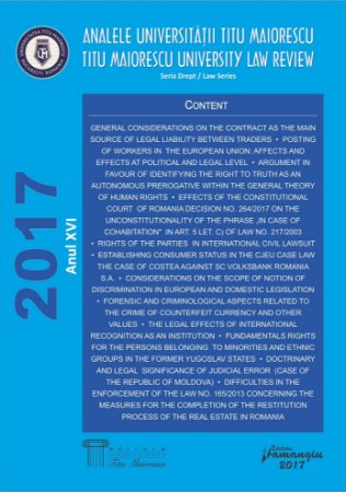The first number of the Titu Maiorescu University Law Review has appeared in 2002. The goal was to mark the most important scientific results of the students, doctoral students and professors from the Law Faculty, and also of the specialists in juridical field which our institution is collaborating with. The editorial board includes academics from prestigious institutions of higher education from the country and abroad. Also, in order to ensure greater international scientific visibility, beginning with VIIIth issue, the review is published in English (with some contributions in French, as Titu Maiorescu University is member of Agence Universitaire de la Francophonie). The Titu Maiorescu University Law Review is indexed in HeinOnline and CEEOL international databases.