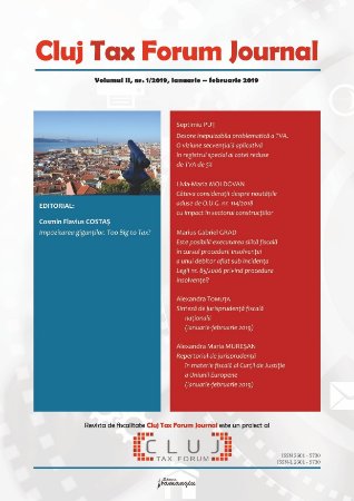 Rubricile obisnuite de jurisprudenta fiscala (atat cea Curtii de Justitie a Uniunii Europene, cat si cea nationala), consistente si cu probleme de maxima actualitate, completeaza armonios continutul acestui prim numar al anului 2019 din Cluj Tax Forum Journal.