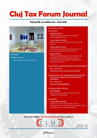 Cluj Tax Forum Journal nr. 3/2020, cel de-al doilea numar de pandemie, pastreaza fiscalitatea in aceeasi atmosfera existentialista creata in Cluj Tax Forum Journal nr. 2/2020. Observam ca blazarea si asumarea pozitiva a conditiei ca optiuni posibile isi pot gasi cu usurinta locul si in forumul fiscal (cu bolovan cu tot, Sisif este prezent si aici) si pot tulbura linistea chiar si in acele institutii ce ne apar, la o prima vedere, pragmatice si lipsite de framantari filosofice, cum ar fi Taxa pe valoare adaugata. Astfel, odata transpusi in acest context, vom putea afla, printre altele, din paginile Cluj Tax Forum Journal nr. 3/2020: