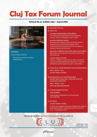 Cluj Tax Forum Journal nr. 4/2020 abordeaza o alta latura a zilelor „pandemice”: cealalta viata – viata on line. Asa cum statueaza si Editorialul acestui numar, „Going Electronic pare sa fie un moment la fel de important precum revolutia industriala, descoperirea dinamitei de catre Alfred Nobel sau identificarea unor vaccinuri pentru bolile cu mortalitate ridicata” (Cosmin Flavius Costas).