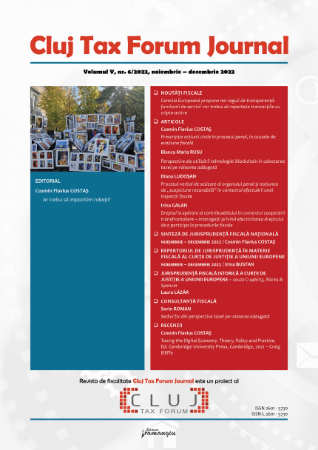 • Colectarea TVA. tehnologia blockchain. In conditiile unei dezvoltari continue a tehnologiei, solutiile administratiilor fiscale clasice nu mai raspund problemelor aparute in stabilirea, gestionarea si colectarea creantelor fiscale, resimtindu-se tot mai stringent nevoia de a identifica solutii moderne si optimizate. Tehnologia de tip blockchain reprezinta o solutie viabila, cu utilizare multipla si perspective de imbunatatire a procedurii fiscale, in special prin mecanisme de prevenire a fraudei si evaziunii fiscale. Vom regasi in paginile acestui numar o analiza pragmatica asupra posibilitatii de implementare a unei tehnologii de tip blockchain pentru monitorizarea operatiunilor generatoare de TVA si asupra modalitatilor in care aceasta tehnologie poate sa serveasca colectarii mai eficiente a taxei si reducerii fraudei la TVA, dar si sa realizeze previziuni asupra provocarilor pe care le poate crea implementarea unui sistem digitalizat in stabilirea si colectarea creantelor fiscale.
