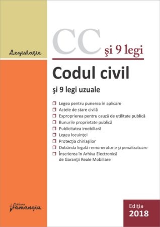 Codul civil si 9 legi uzuale reda Codul civil si 9 dintre cele mai uzitate legi speciale relevante in materie, si anume cele privitoare la actele de stare civila, bunurile proprietate publica, expropriere, cadastrul si publicitatea imobiliara, inscrierea in Arhiva Electronica de Garantii Reale Mobiliare, protectia chiriasilor, dobanda legala remuneratorie si penalizatoare.