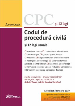 Prin Legea nr. 310/2018 (in vigoare de la 21 decembrie 2018), noul Cod de procedura civila a suferit cea mai ampla modificare de la intrarea sa in vigoare in februarie 2013. Aceasta editie a volumului Codul de procedura civila si 12 legi uzuale include analiza modificarilor aduse prin Legea nr. 310/2018, sub semnatura domnului Profesor univ. dr. Gabriel Boroi si a doamnei Judecator dr. Delia Narcisa Theohari.