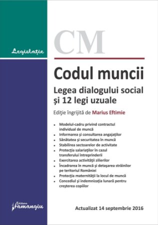 Codul muncii. Legea dialogului social si 12 legi uzuale cuprinde cele doua legi de baza in domeniu (Legea nr. 53/2003 si Legea nr. 62/2011), precum si alte 12 acte normative frecvent utilizate de specialistii dreptului muncii: Legea nr. 67/2006 privind protectia drepturilor salariatilor in cazul transferului intreprinderii, al unitatii sau al unor parti ale acestora; Legea nr. 344/2006 privind detasarea salariatilor in cadrul prestarii de servicii transnationale; Legea nr. 319/2006 a securitatii si sanatatii in munca; Legea nr. 467/2006 privind stabilirea cadrului general de informare si consultare a angajatilor; Legea nr. 52/2011 privind exercitarea unor activitati cu caracter ocazional desfasurate de zilieri; Legea nr. 91/2014 privind acordarea unei zile lucratoare libere pe an pentru ingrijirea sanatatii copilului; O.U.G. nr. 96/2003 privind protectia maternitatii la locurile de munca; O.U.G. nr. 111/2010 privind concediul si indemnizatia lunara pentru cresterea copiilor; Titlul I al O.G. nr. 25/2014, intitulat „Incadrarea in munca si detasarea strainilor pe teritoriul Romaniei”; H.G. nr. 500/2011 privind registrul general de evidenta a salariatilor; H.G. nr. 1260/2011 privind sectoarele de activitate stabilite conform Legii nr. 62/2011; Ordinul nr. 64/2003 pentru aprobarea modelului-cadru al contractului individual de munca.