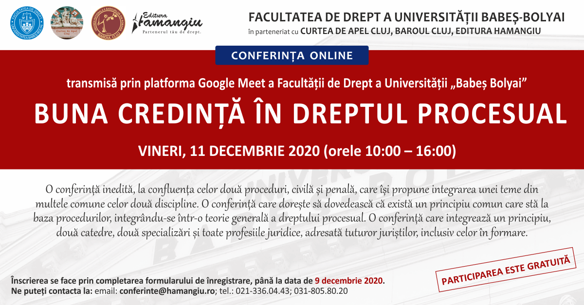 - transmisă prin intermediul platformei Google Meets a Facultății de Drept a Universității „Babeș Bolyai” din Cluj-Napoca