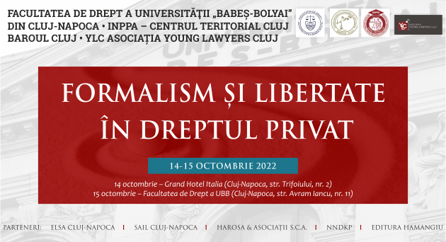 Facultatea de Drept – Universitatea Babeș-Bolyai, Cluj-Napoca împreună cu Institutul Național pentru Pregătirea și Perfecționarea Avocaților – Centrul Teritorial Cluj, Baroul Cluj și YLC Asociația Young Lawyers Cluj vă învită la Conferinta Formalism și libertate în dreptul privat eveniment ce va avea loc în data de 14 octombrie 2022 la Grand Hotel Italia - Cluj-Napoca și în data de 15 octombrie 2022 Facultatea de Drept a UBB.