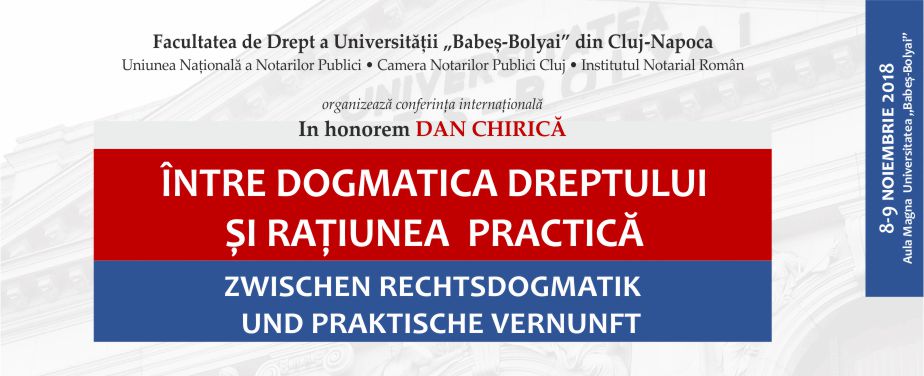 Universitatea „Babeș-Bolyai” Cluj Napoca – Facultatea De Drept în parteneriat cu Uniunea Națională a Notarilor Publici (UNNPR), Camera Notarilor Publici Cluj și Institutul Notarial Român (INR) organizează, în perioada 8 – 9 noiembrie 2018, Conferința Internațională In honorem DAN CHIRICĂ. Între Dogmatica Dreptului și Rațiunea Practică/ Zwischen Rechtsdogmatik und praktische Vernunft.