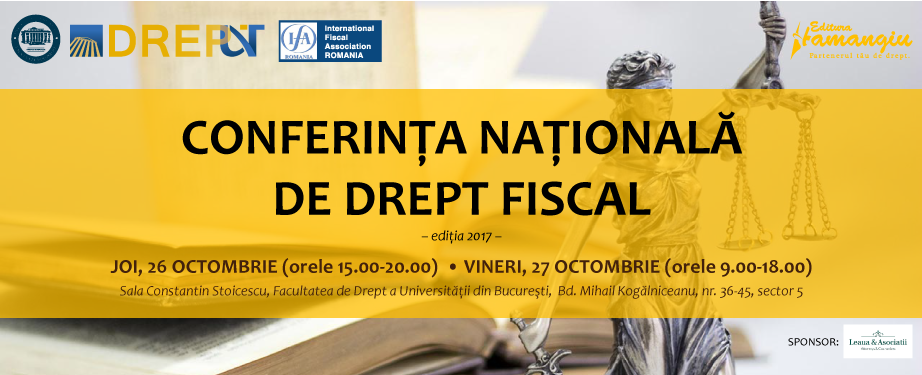 Facultatea de Drept a Universităţii din Bucureşti, Facultatea de Drept a Universităţii de Vest și International Fiscal Association România, în parteneriat cu Editura Hamangiu, vă invită să participați la ediția a IV-a a CONFERINȚEI NAȚIONALE DE DREPT FISCAL, eveniment care va avea loc joi, 26 octombrie (orele 15.00-20) și vineri, 27 octombrie 2017 (orele 9,00-18,00), în Sala Constantin Stoicescu – Facultatea de Drept a Universităţii din Bucureşti, Bd. Mihail Kogălniceanu, nr. 36-45, sector 5.