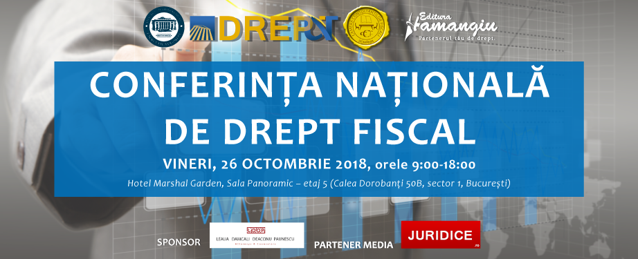 Facultatea de Drept a Universităţii din Bucureşti, Facultatea de Drept a Universităţii de Vest și Camera Consultanților Fiscali, în parteneriat cu Editura Hamangiu, vă invită să participați la ediția a V-a a CONFERINȚEI NAȚIONALE DE DREPT FISCAL, eveniment care va avea loc vineri, 26 octombrie, orele 9,00-18,00, în Sala Panoramic a Hotelului Marshal Garden – Calea Dorobanților, nr. 50B, sector 1, București.