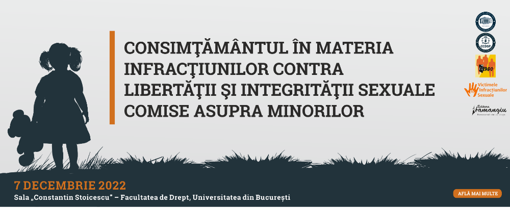 Facultatea de Drept, Universitatea din București, prin Centrul de Cercetare în Domeniul Științelor Penale, Editura Hamangiu, Asociația GRADO și Asociația pentru Victimele Infracțiunilor Sexuale organizează, la data de 7 decembrie 2022, conferința cu titlul „Consimțământul în materia infracțiunilor contra libertății și integrității sexuale comise asupra minorilor”.