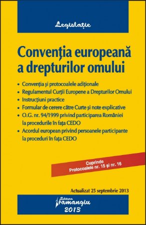 Lucrarea cuprinde Conventia europeana si protocoalele aferente, inclusiv Protocoalele nr. 15 si nr. 16, Regulamentul Curtii (in vigoare de la 1 iulie 2013), precum si legislatia interna in materie, actualizata la 25 septembrie 2013.