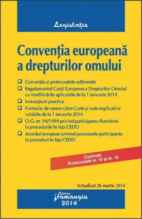 Lucrarea cuprinde Conventia europeana si protocoalele aferente, inclusiv Protocoalele nr. 15 si nr. 16, Regulamentul Curtii (editia in vigoare de la 1 ianuarie 2014), precum si legislatia interna in materie, actualizata la 26 martie 2014.