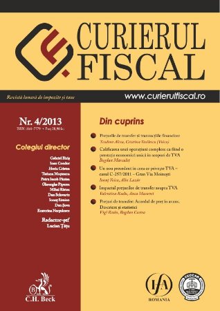 - articolul semnat de Valentina Radu si Anca Macovei (Manager/Consultant, Departamentul de impozite indirecte, PwC) priveste tot problematica preturilor de transfer, concluzionand ca dosarul preturilor de transfer va fi un instrument important ce poate fi folosit de acum inainte la stabilirea bazei de impozitare pentru parti afiliate care au drept limitat de recuperare a TVA. Totusi, in tranzactii in care identificarea de tranzactii comparabile nu va fi posibila, ramane de vazut care va fi abordarea autoritatilor fiscale in ceea ce priveste baza de impozitare a TVA comparativ cu stabilirea preturilor de transfer pentru scopuri privind impozitarea profiturilor companiilor afiliate.
