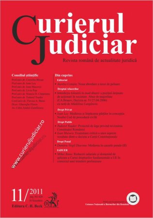 Numarul de Noiembrie al Revistei Curierul Judiciar debuteaza cu Editorialul semnat de conf. univ. dr. Aurelia Cotutiu, Noua abordare judiciara a taxei pe poluare: „Cum este posibil ca toate organele puterii Statului democrat roman, in toata perioada de la aderare a Romaniei la Uniunea Europeana, 1.01.2007, pana in prezent, sa nesocoteasca in cel mai vadit mod obligatia de a legifera, de a organiza aplicarea legii si de a solutiona cauzele litigioase, in domeniul inmatricularilor de autovehicule, in acord cu noua ordine de drept a Uniunii Europene?”