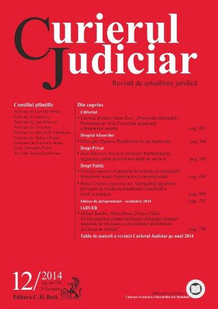 Asa cum v-am obisnuit, ultimul numar din fiecare an al revistei Curierul Judiciar contine Tabla de materii pe anul 2014, in care puteti consulta toate materialele publicate in numerele din 2014, cu indicarea rubricii, titlului, autorului si a numarului de revista in care se regasesc acestea.