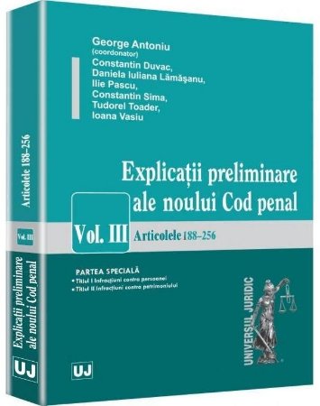 Lucrarea Explicatii preliminare ale noului Cod penal. Vol III - Partea speciala - art. 188-256 constituie cel de al III-lea volum din valoroasa opera a colectivului de autori condus de prof. univ. dr. George Antoniu si consacrata comentarii noului Cod penal sub titlul „Explicatii preliminare ale noului Cod penal”.