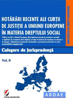 Din cuprinsul acestui volum se poate retine, cu titlu exemplificativ, ca dreptul Uniunii Europene se opune ca perioadele de serviciu efectuate de un functionar temporar al unei administratii publice sa nu fie luate in considerare pentru accesul acestuia din urma, devenit intre timp functionar de cariera, la o promovare interna la care pot sa pretinda numai functionarii de cariera, cu exceptia cazului in care aceasta excludere este justificata de motive obiective, iar simplul fapt ca functionarul temporar a efectuat perioadele de serviciu respective in temeiul unui contract sau al unui raport de munca pe durata determinata nu constituie un asemenea motiv obiectiv, se opune unei reglementari nationale care, in privinta lucratorilor pe fractiune de norma de tip vertical ciclic, exclude perioadele nelucrate din calculul vechimii impuse pentru dobandirea unui drept la o astfel de pensie, cu exceptia cazului cand o asemenea diferenta de tratament este justificata de motive obiective, declaratii publice de excludere a recrutarii unui fotbalist prezentat ca fiind homosexual pot fi calificate drept „fapte care permit prezumtia existentei unei discriminari” in ceea ce priveste un club de fotbal profesionist in cazul in care declaratiile vizate sunt facute de o persoana care se prezinta si este perceputa in media si in societate ca fiind principalul conducator al acestui club, fara sa aiba totusi in mod necesar capacitatea juridica de a angaja clubul sau de a l reprezenta in materie de recrutare, nu se opune unui sistem de pensii ocupationale in temeiul caruia un angajator plateste, ca element al remuneratiei, contributii la pensie progresive in functie de varsta, cu conditia ca tratamentul diferentiat pe motive de varsta care rezulta din aceasta sa fie adecvat si necesar pentru atingerea unui obiectiv legitim, ceea ce revine instantei nationale sa verifice, se opune unei dispozitii dintr o conventie colectiva precum cea in discutie in litigiul principal, in temeiul careia un lucrator salariat care incheie un pact civil de solidaritate cu o persoana de acelasi sex este exclus de la dreptul de a obtine avantaje precum zile de concediu special si o prima salariala, acordate lucratorilor salariati cu ocazia casatoriei, atunci cand reglementarea nationala a statului membru in cauza nu permite persoanelor de acelasi sex sa se casatoreasca, in masura in care, tinand seama de obiectul si de conditiile de acordare ale acestor avantaje, el se gaseste intr o situatie comparabila cu cea a unui lucrator care se casatoreste, nu se opune unei reglementari nationale care stabileste la 30 de ani varsta maxima pentru recrutarea in cadrul serviciului tehnic intermediar de pompieri, se opune unei reglementari nationale in temeiul careia lucratorii care pot beneficia de o pensie pentru limita de varsta platita de angajatorul lor in temeiul unui sistem de pensii la care au aderat inainte de implinirea varstei de 50 de ani nu pot obtine, exclusiv pentru acest motiv, o indemnizatie speciala de concediere menita sa favorizeze reintegrarea profesionala a lucratorilor care au o vechime in munca in cadrul intreprinderii mai mare de 12 ani, nu se opune unei legislatii nationale care prevede pensionarea din oficiu a profesorilor universitari la implinirea varstei de 68 de ani si continuarea activitatii lor dupa varsta de 65 de ani numai prin intermediul unor contracte pe durata determinata de un an, care pot fi reinnoite de cel mult doua ori, in masura in care aceasta legislatie urmareste un obiectiv legitim, legat, in special, de politica de ocupare a fortei de munca si a pietei muncii, precum crearea unui invatamant de calitate si repartizarea optima a posturilor de profesori intre generatii, si in masura in care permite atingerea acestui obiectiv prin mijloace corespunzatoare si necesare, se opune ca o clauza cuprinsa intr o conventie colectiva precum cea din actiunea principala sa stabileasca la 60 de ani varsta limita de la care se considera ca pilotii nu mai au capacitatile fizice pentru a si exercita activitatea profesionala, desi reglementarea nationala si cea internationala stabilesc aceasta varsta la 65 de ani, nu se opune unei masuri nationale care permite unui angajator sa ii desfaca unui salariat contractul de munca pentru simplul motiv ca acesta din urma a implinit varsta de 67 de ani si care nu tine seama de nivelul pensiei pentru limita de varsta pe care o va primi persoana interesata, intrucat masura respectiva este justificata in mod obiectiv si rezonabil de un obiectiv legitim care tine de politica ocuparii fortei de munca si a pietei muncii si constituie un mijloc corespunzator si necesar de realizare a acestui obiectiv.
