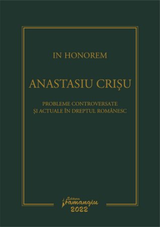 In Honorem Anastasiu Crisu. Probleme controversate si actuale in dreptul romanesc reprezinta o frumoasa colectie de studii dedicate domnului profesor Anastasiu Crisu cu ocazia implinirii varstei de 65 de ani si, totodata, ca moment de implinire a unei etape. Contributiile autorilor acestui volum se doresc a fi un omagiu si, asa cum se statueaza in chiar primele randuri ale acestui manuscris, un semn de pretuire a „unei activitati desfasurate la inalta tinuta academica in respectul principiilor de drept care ne anima pe toti, pentru realizarea scopului nobil al acesteia asa cum este daltuit pe frontispiciul Aulei Magna «(...) statornicirea spiritului de dreptate (...)» si triumful principiilor de drept in tara si in lume” (Prof. univ. dr. Constantin Mitrache).