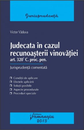 Forma structurata a lucrarii, complexitatea si varietatea problemelor de drept prezentate tinand de interpretarea si aplicarea art. 3201 C. proc. pen., precum si notele doctrinare inserate fac ca lucrarea domnului judecator Victor Vaduva sa constituie un instrument indispensabil in intelegerea procedurii abreviate a judecatii in cazul recunoasterii vinovatiei.