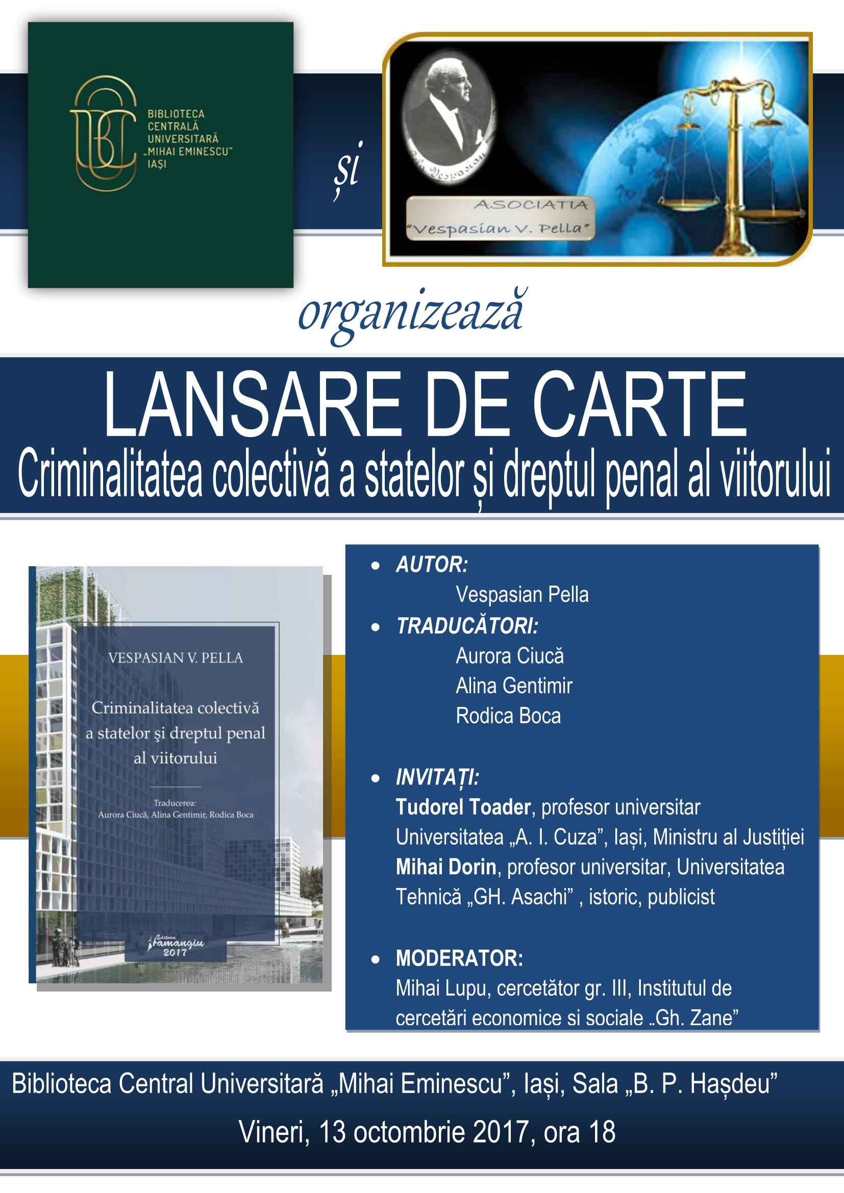 Biblioteca Centrală Universitară „Mihai Eminescu” Iaşi şi Asociaţia „Vespasian V. Pella” va invita sa participaţi la evenimentul de lansare a volumului Criminalitatea colectivă a statelor şi dreptul penal al viitorului, autor: Vespasian Pella, traducători: Aurora Ciuca, Alina Gentimir, Rodica Boca, volum apărut recent la Editura Hamangiu.