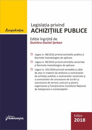 Cartea cuprinde legislatia primara in domeniul achizitiilor publice, si anume Legea nr. 98/2016 privind achizitiile publice, Legea nr. 99/2016 privind achizitiile sectoriale si Legea nr. 101/2016 privind remediile si caile de atac in materie de atribuire a contractelor de achizitie publica, a contractelor sectoriale si a contractelor de concesiune de lucrari si concesiune de servicii, precum si pentru organizarea si functionarea Consiliului National de Solutionare a Contestatiilor.