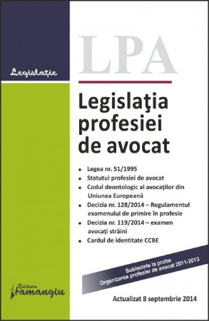 Legislatia profesiei de avocat contine actele esentiale pentru membrii acestui corp profesional: Legea nr. 51/1995 pentru organizarea si exercitarea profesiei de avocat, astfel cum a fost modificata prin Decizia Curtii Constitutionale nr. 297/2014, Statutul profesiei de avocat, cu modificarea adusa prin Hotararea nr. 966/2014, Codul deontologic al avocatilor din Uniunea Europeana, O.U.G. nr. 221/2000 privind pensiile si alte drepturi de asigurari sociale ale avocatilor, Regulamentul de organizare si functionare a U.N.B.R. si de desfasurare a sedintelor Consiliului U.N.B.R. sau recenta Decizie nr. 113/2014 (Regulamentul privind emiterea, administrarea si utilizarea cardului de identitate CCBE pentru legitimare de catre avocatii definitivi din Romania), dar si acte indispensabile aspirantilor la statutul de avocat: Decizia nr. 128/2014 (Regulamentul examenului de primire in profesia de avocat), Hotararea nr. 962/2014 privind organizarea examenului de primire in profesie – sesiunea septembrie 2014, Hotararea nr. 525/2012 privind adoptarea Regulamentului examenului de absolvire a I.N.P.P.A.