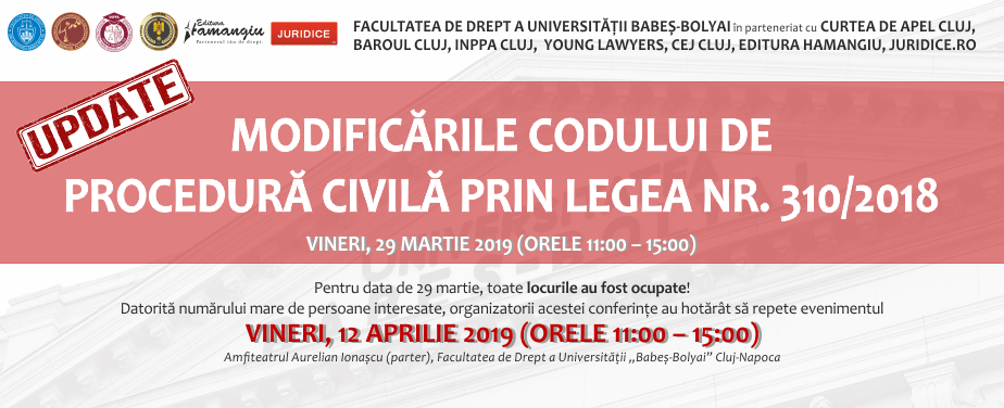 Facultatea de Drept a Universității „Babeș-Bolyai” în parteneriat cu Baroul Cluj, Curtea De Apel Cluj, INPPA Cluj, Young Lawyers, CEJ Cluj, Editura Hamangiu organizează conferința Modificările Codului de procedură civilă prin Legea nr. 310/2018. (Vineri, 12 aprilie, orele 11:00 - 15:00).