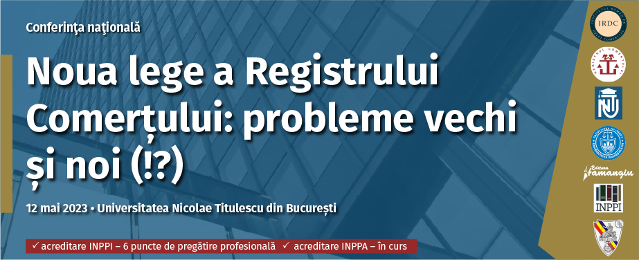 La jumătate de an de aplicare a noii legi a registrului comerțului – o reglementare cu un important impact juridic și economic – vă invităm la o analiză consistentă a problematicilor sale, identificate de mediul academic, de practica judecătorească, precum și în practica registrului comerțului, cu accent preponderent pe aspectele practice, pentru provocarea de discuții și propunerea de posibile soluții.