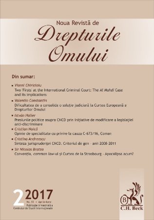 Cititorul va gasi in acest numar al Noii Reviste a Drepturilor Omului, printre subiectele de interes: prima decizie a Curtii Penale Internationale motivata de distrugerea bunurilor culturale (comentata de Viorel Chiricioiu), opinia disidenta a judecatorului Paulo Pinto de Albuquerque in cauza A si B c. Norvegia (sustinuta de Valentin Constantin), presiunile exercitate asupra CNCD (autor István Haller). Sinteza facuta asupra unor hotarari ale CNCD de Cristina Andreescu, impreuna cu investigarea jurisprudentei CEDO completeaza temele cu dominanta practica ale actualului numar. Pentru iubitorii de gandire juridica revista propune eseul unei autoritati internationale (Lordul Bratza), meditatia lui asupra raporturilor dintre Common law si Conventia europeana a drepturilor omului.