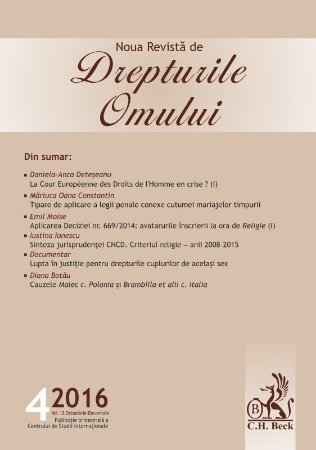 Cel de-al patrulea numar al trimestrialului Noua Revista de Drepturile Omului pe anul 2016 contine trei materiale care implica problematica religioasa: articolul lui Emil Moise privitor la avatarurile inscrierii la ora de Religie si sinteza Iustinei Ionescu asupra jurisprudentei CNCD pe criteriul religiei; al treilea material, alcatuit din patru piese, documenteaza „lupta in justitie pentru drepturile cuplurilor de acelasi sex”, cu indiscutabila dimensiune religioasa.