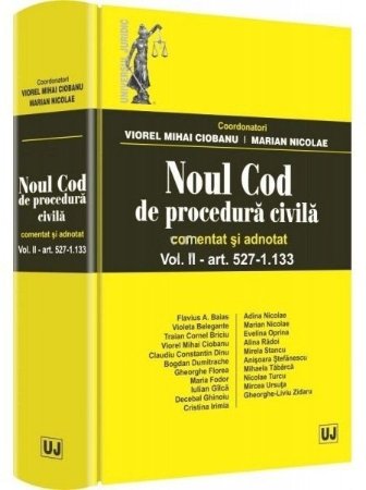 Noul Cod de procedura civila – comentat si adnotat (vol. I – art. 1-526 si vol. II – art. 527-1.133), sub coordonarea dlui prof. univ. dr. Viorel Mihai Ciobanu, presedintele Comisiei de elaborare a proiectului Legii nr. 134/2010, si a dlui prof. univ. dr. Marian Nicolae, membru al aceleiasi comisii, este o lucrare completa, practica si explicativa care asigura „cheia” interpretarii, cunoasterii si aplicarii corecte, unitare si juste a noii reglementari procesuale civile, reglementare care constituie totodata dreptul comun (ius commune) pentru orice alte materii procesuale, cum sunt procedura contenciosului constitutional, a contenciosului administrativ general, a contenciosului fiscal ori a contenciosului penal si contraventional, dupa caz.