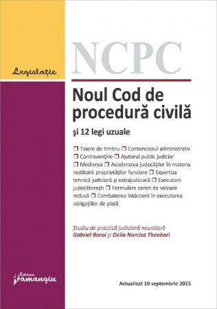 In plus, Noul Cod de procedura civila si 12 legi uzuale contine, integral sau in extras, 10 dintre cele mai uzuale acte normative care intregesc cadrul legal al procedurii civile: medierea, taxele de timbru, contenciosul administrativ, ajutorul public judiciar in materie civila, activitatea executorilor judecatoresti si a expertilor tehnici judiciari, regimul juridic al contraventiilor, masurile pentru combaterea intarzierii in executarea obligatiilor de plata a unor sume de bani rezultand din contracte incheiate intre profesionisti si intre acestia si autoritati contractante, formularele privind cererile cu valoare redusa.