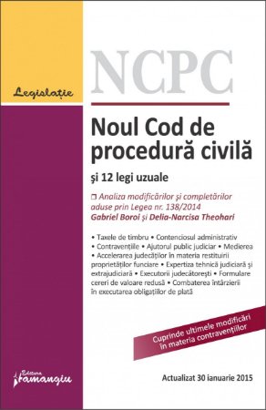 In plus, am inclus, integral sau in extras, 10 dintre cele mai uzuale acte normative care intregesc cadrul legal al procedurii civile: medierea, taxele de timbru, contenciosul administrativ, ajutorul public judiciar in materie civila, activitatea executorilor judecatoresti si a expertilor tehnici judiciari, regimul juridic al contraventiilor, masurile pentru combaterea intarzierii in executarea obligatiilor de plata a unor sume de bani rezultand din contracte incheiate intre profesionisti si intre acestia si autoritati contractante, formularele privind cererile cu valoare redusa.