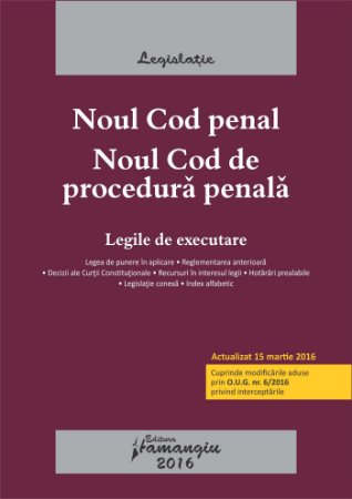 Noul Cod penal. Noul Cod de procedura penala. Legile de executare reuneste textele actualizate ale noilor coduri penale, inclusiv cu modificarile aduse prin O.U.G. nr. 6 din 11 martie 2016 in materia interceptarilor comunicatiilor. Pe langa acestea, am inclus si cele doua legi de executare a pedepselor, a masurilor privative si neprivative de libertate – Legile nr. 253 si nr. 254 din 2013, intrate in vigoare la 1 februarie 2014, odata cu noile coduri.