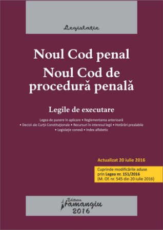 Noul Cod penal. Noul Cod de procedura penala. Legile de executare reuneste textele actualizate ale noilor coduri penale, inclusiv cu completarile aduse prin Legea nr. 151/2016 (M. Of. nr. 545 din 20 iulie 2016). Pe langa acestea, am inclus si cele doua legi de executare a pedepselor, a masurilor privative si neprivative de libertate – Legile nr. 253 si nr. 254 din 2013, care au fost, de asemenea, modificate sau completate prin Legea nr. 151/2016.
