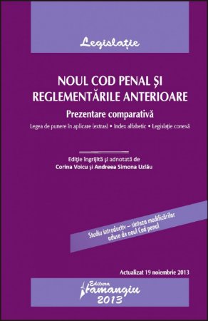 Lucrarea de fata ofera o prezentare comparativa, pe articole, a noului Cod penal, cu modificarile si completarile ulterioare, si a reglementarilor anterioare – in primul rand Codul penal de la 1969, dar si alte acte normative ale caror dispozitii care incriminau diferite fapte au fost preluate, cu sau fara modificari, in noul cod (cum ar fi Legea nr. 678/2001 privind prevenirea si combaterea traficului de persoane, O.U.G. nr. 195/2002 privind circulatia pe drumurile publice, Legea nr. 365/2002 privind comertul electronic, Titlul III privind prevenirea si combaterea criminalitatii informatice din Legea nr. 161/2003 etc.), aceste texte urmand a fi abrogate de la 1 februarie 2014.