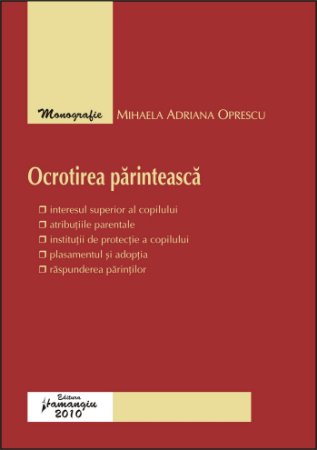Din doctrina noastra nu lipsesc lucrari asupra institutiei ocrotirii parintesti, unele, pe drept cuvant, remarcate si apreciate. Deja elogiem lucrarea de fata, afirmand, cu toata obiectivitatea, ca ea trezeste si retine atentia cititorului. Fara indoiala, autoarea, elaborandu-si recent teza de doctorat, a profitat de numeroasele noutati doctrinare, jurisprudentiale si legislative care, toate laolalta, i-au furnizat argumente importante si inedite in acest demers. Institutia insasi a evoluat, modificand perspectiva asupra statutului minorului: sistemul de protectie a copilului si a familiei a trecut de la o perspectiva bazata pe nevoi la o perspectiva fundamentata pe drepturi.