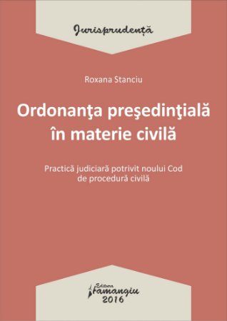 Lucrarea Ordonanta presedintiala in materie civila aduna, in continutul sau, un numar semnificativ de hotarari relevante ale instantelor judecatoresti din intreaga tara (publicate pentru prima oara in aceasta culegere), prezentand, astfel, cele mai des intalnite solutii din practica judiciara in materie civila, date dupa intrarea in vigoare a noului Cod de procedura civila. Cele 137 de spete releva particularitatile procedurii incidente in dreptul civil (apararea drepturilor nepatrimoniale, drepturile chiriasilor, astfel cum sunt reglementate de O.U.G. nr. 40/1999, raporturi de vecinatate, raporturi juridice izvorate din contracte s.a.), in litigiile cu profesionistii si in domeniul proprietatii intelectuale.