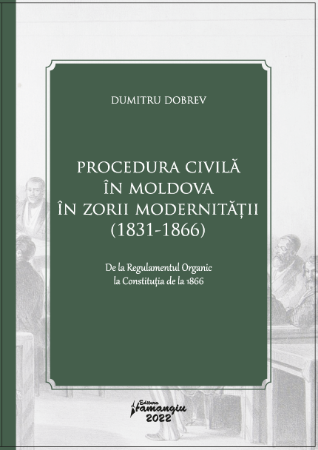 Structurata pe cinci capitole, lucrarea trateaza aspecte privind organizarea justitiei in Moldova, dupa introducerea Regulamentului Organic, competenta instantelor de atunci, diferite incidente procedurale care se puteau ivi, judecata in fata primei instante, in caile de atac si procedurile speciale de care dispuneau petitionarii. Aceasta cercetare nu s-a putut face fara incursiuni obligatorii in aspecte ce tin de viata socio-economica si, uneori, chiar de viziunea asupra politicilor judiciare si a moravurilor elitelor din Moldova, iar mai apoi, din Principatele Unite.