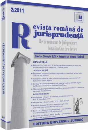 In continuarea eforturilor noului colectiv redactional - care s-au concretizat, incepand cu nr. 1/2011 al revistei, prin rubrici noi, dintre care semnalam "Editorialul" ( Gheorghe Buta, Jurisprudenta - o noua veche provocare) si "Dezbateri RRDJ" (Livia Doina Stanciu, Simona Cristea, Noi tendinte ale cooperarii judiciare in Uniunea Europeana si Statele Unite ale Americii; Laura Radu, Corina Puschin, Modificarile aduse Codului de procedura civila prin Legea nr. 202/2010; Nicu Jidovu, Consideratii privind infractiunea de manipulare a pietei de capital; Sandel Lucian Macavei, Cazul de casare prevazut de pct. 171 al art. 3859 C. pr. pen. privit prin prisma jurisprudentei Inaltei Curti de Casatie si Justitie; Lucian Bernd Sauleanu, Alina Dodocioiu, Jurisprudenta in materia clauzelor abuzive in contractele bancare; Gabriela Cristina Frentiu, Varsta standard de pensionare si legatura cu anul nasterii solicitantului. Practica judiciara; Viviana Onaca, Ioana Burduf, Transmiterea actelor judiciare si extrajudiciare in materie civila si comerciala in si din strainatate; atributiile instantelor romane si Ministerului Justitiei in procedura de transmitere; importanta comunicarii actelor in procedura de recunoastere si executare a hotararilor judecatoresti [I]) - Revista Romana de Jurisprudenta nr. 2/2011 cuprinde solutii doctrinare si jurisprudentiale asupra unor chestiuni de drept cu impact deosebit, decurgand fie din noutatea reglementarii, fie din modul inedit de rezolvare.