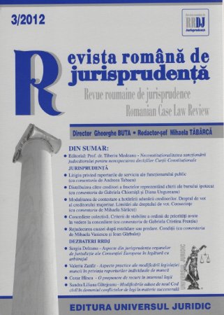 Rubrica dedicata Jurisprudentei Curtii de Justitie a Uniunii Europene aduce in atentia cititorilor un amplu articolul de drept comparat semnat de dna judecator dr. Diana Ungureanu vizand notiunea de "ajutor de stat" in jurisprudenta nationala si europeana. Rubrica Dezbateri RRDJ contine aprecieri doctrinare, cu aplicare practica imediata, asupra unor probleme intalnite frecvent in jurisprudenta instantelor sau a unor probleme de drept actuale, generate de textele noilor Coduri. In acest sens, enumeram urmatoarele articole, al caror continut este evocat sugestiv de chiar titlul lor: